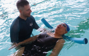 Le maître-nageur est présent dans l’eau pendant toute la séance pour rassurer les participants, corriger les mouvements et favoriser un apprentissage efficace en toute sécurité.